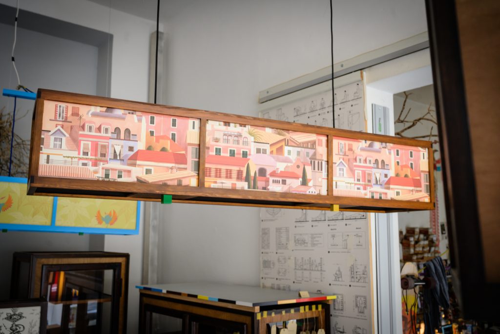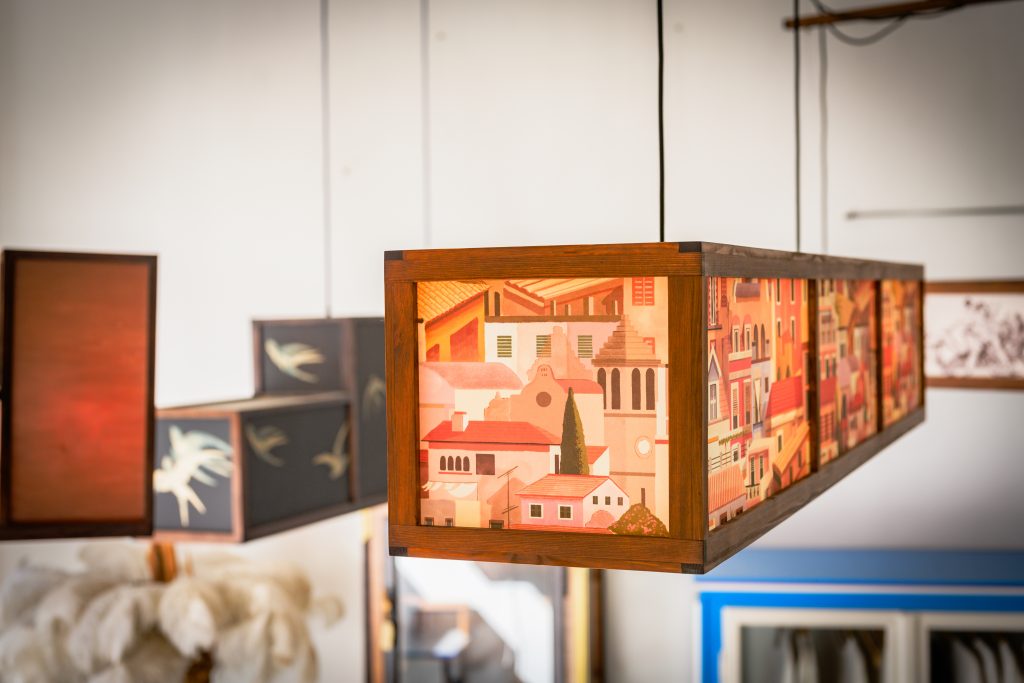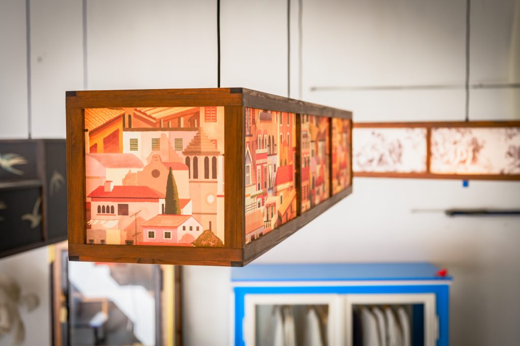 - Beschreibung ein Lichtobjekt der Leichtigkeit bespannt mit Tapete mit 2 eingelegten Schiebern um das licht zu verändern oder es zu versetzen