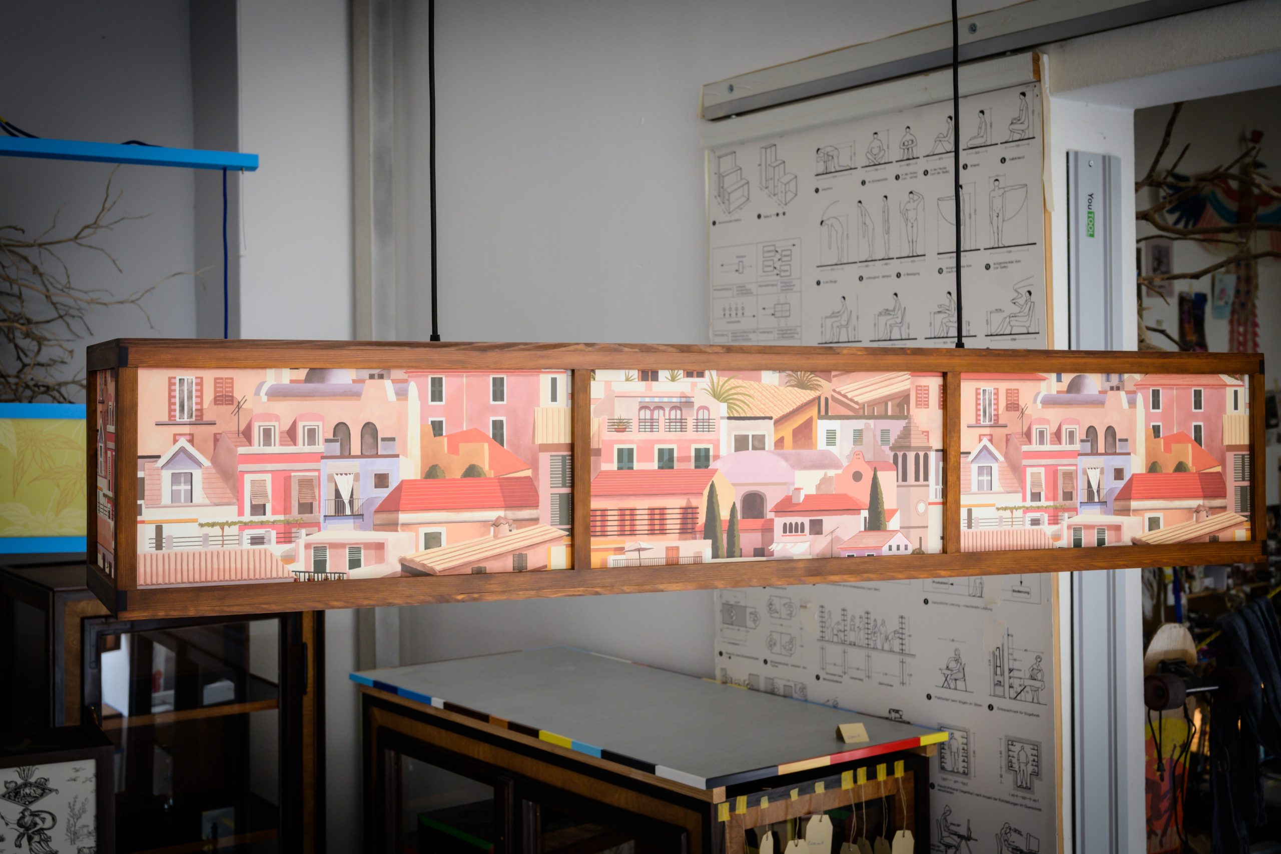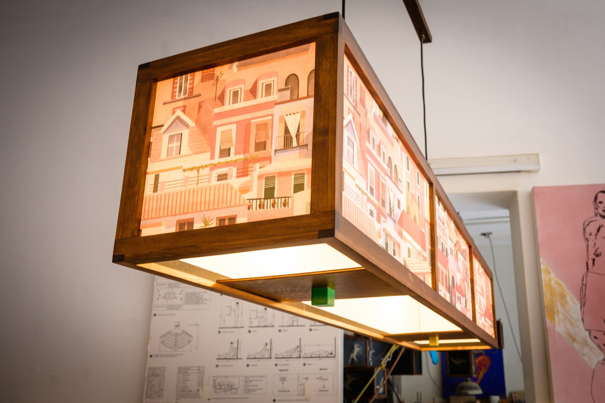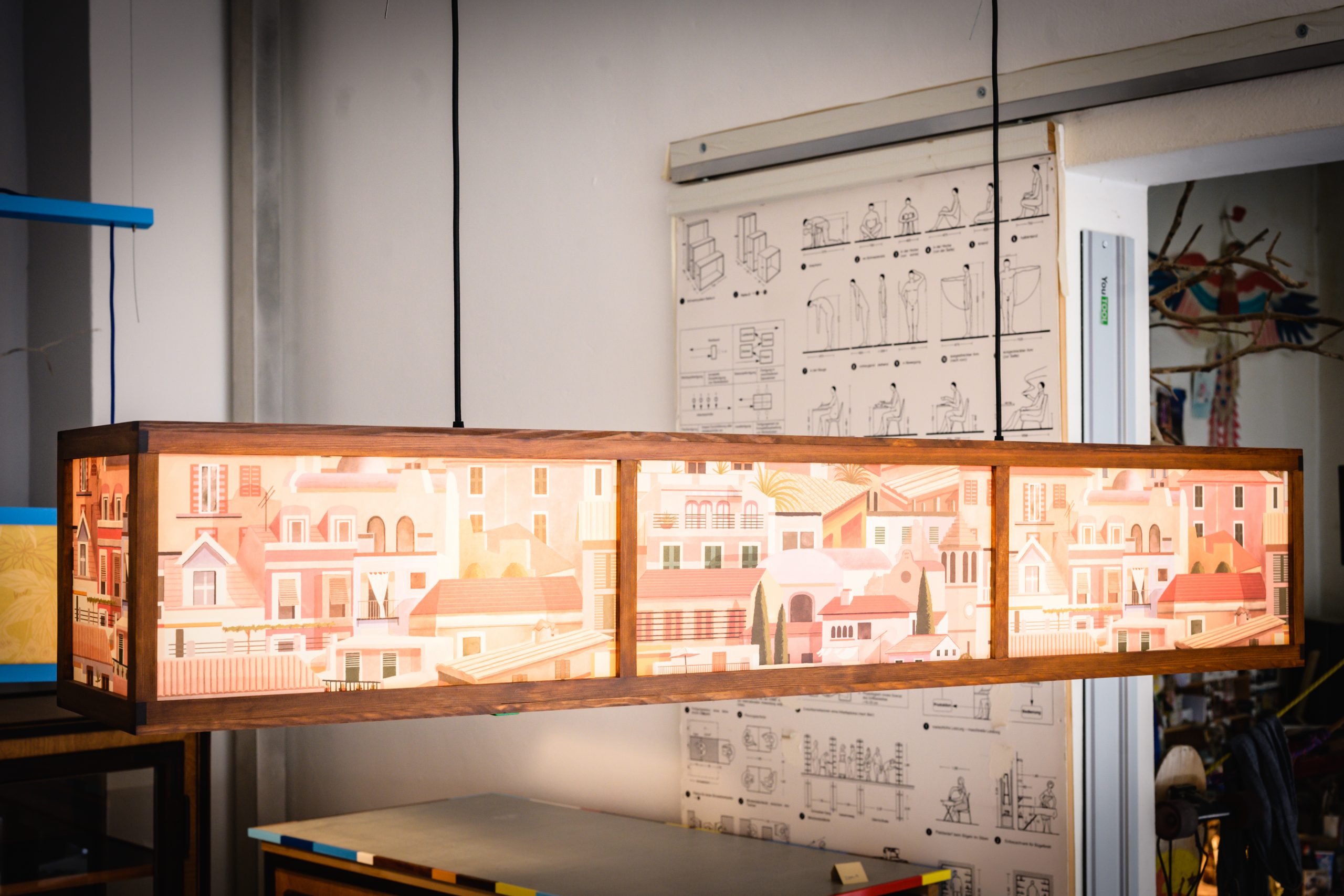 - Beschreibung ein Lichtobjekt der Leichtigkeit bespannt mit Tapete mit 2 eingelegten Schiebern um das licht zu verändern oder es zu versetzen
