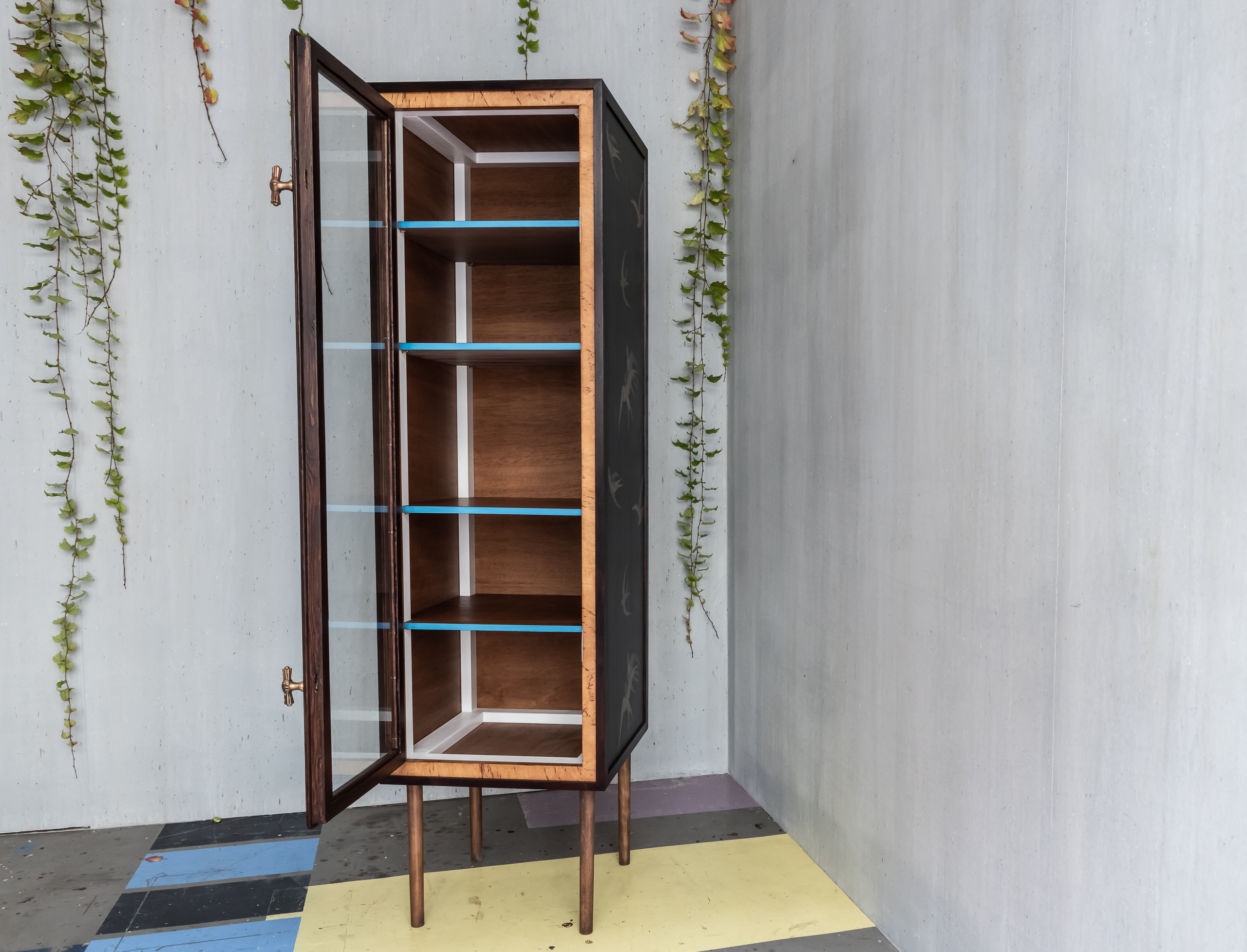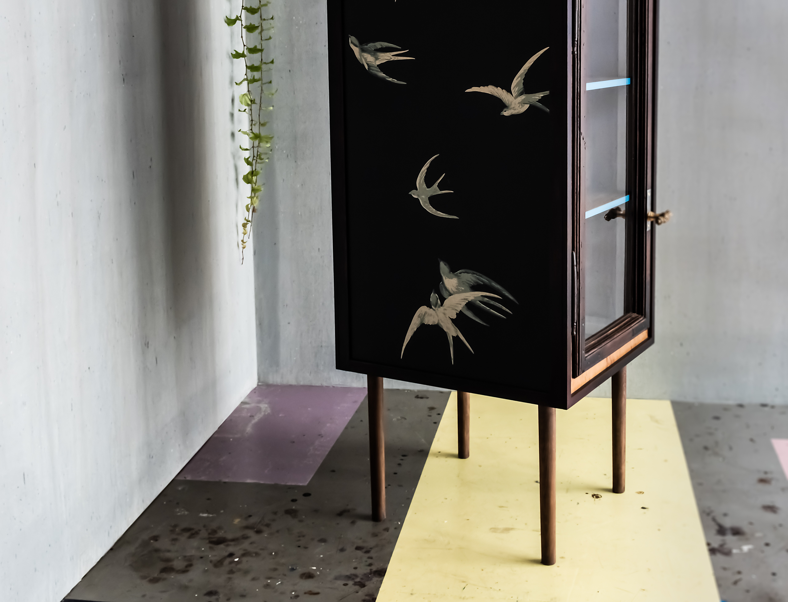 - Die Seitenwände sind mit englischer Tapete (schwarz & gold, Schwalbenmuster)