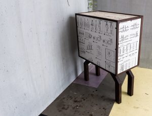 3 Schubläden mit rotem Samt, Palisadenfront, technischen DIN Norm Zeichnungen an den Seiten auf der Oberplatte und Rückfront